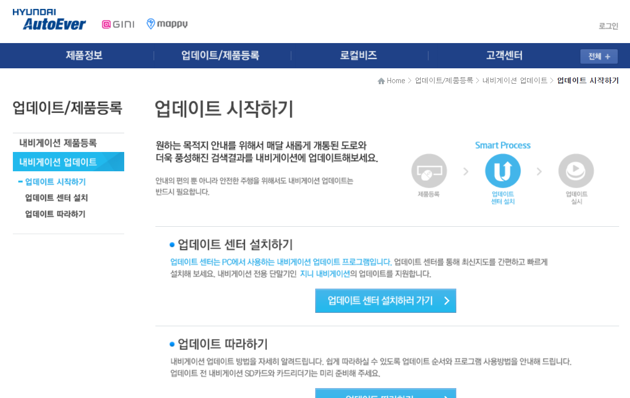 [업데이트/제품등록] --> [네비게이션 업데이트]를 선택한다. 열려진 홈페이지에 보면 업데이트 센터 설치가 있습니다. 클릭하여 업데이트 센터 설치를 진행합니다.