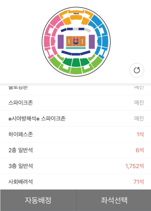 실시간 좌석 경쟁: 인기 경기일 경우 동시간대에 많은 사용자가 접속하므로 신속한 좌석 선택이 필요합니다.